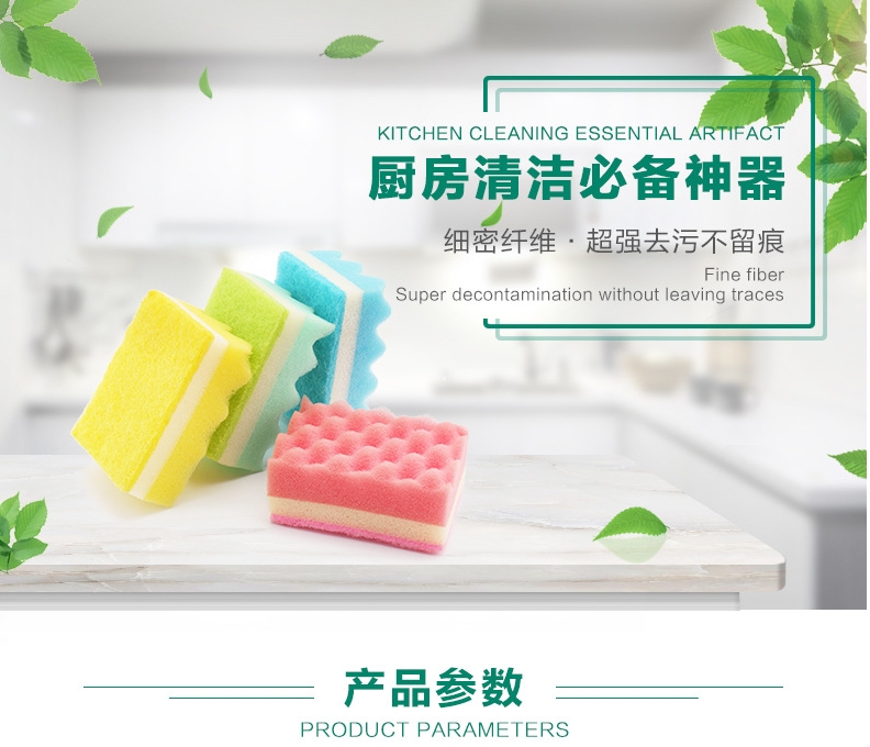 是用百洁布(涤纶纤维)粘合海绵而成的产品,百洁布一面粗糙,适合清洁难于清洁的污垢,海绵的一面,柔软不伤害磨损厨具表面,相互结合轻松把碗筷洗干净。