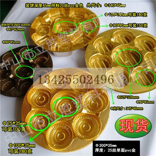 先进生产设备,十几年的生产从事经绘验,专业为食品,月饼托 圆形,月饼托方形,月饼托盒,月饼托盘等业务,吸塑是一种塑料加工工艺,主要原理是将平展的塑料硬片材加热变软后,采用真空吸附于模具表面,冷却后成型的,吸塑产品应用广泛,其主要用于电、电器行业,食品行业,五金工具,化妆品行业玩具行业、日用品行业,医药、保健品,汽车,文具、文体用品等等行业,今天说的是月饼包装(吸塑内衬内托),采用的是pp食品级材料、防潮效果好、防静电内托、做工精美、它柔韧、质轻、密度、设计新颖、经久耐用、干净卫生、可以直接接触食品、无污染食品级内托、也成为当前的绿色包装。阳春市月饼托厂家