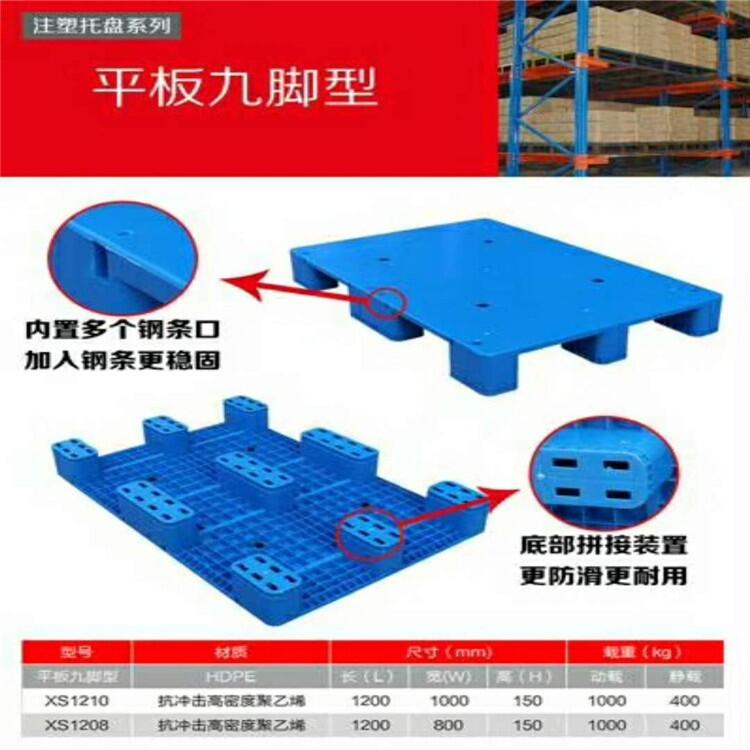 塑料托盘选用具有高冲击强度的HDPE(低压高密度聚乙烯)或PP (聚丙烯)为原料注塑而成。 产品从结构区分为单面使用(九脚型,田字型,川字型,日字型)和双面使用。以平面形状分类可以分为表面网格型(网格九脚,网格田字型,网格川字型,网格双面型)和表面平板型(平板九脚型,平板田字型,平板川字型,平板双面型)。以制作工艺区分可分为焊接型,一体成型,内置钢管型。