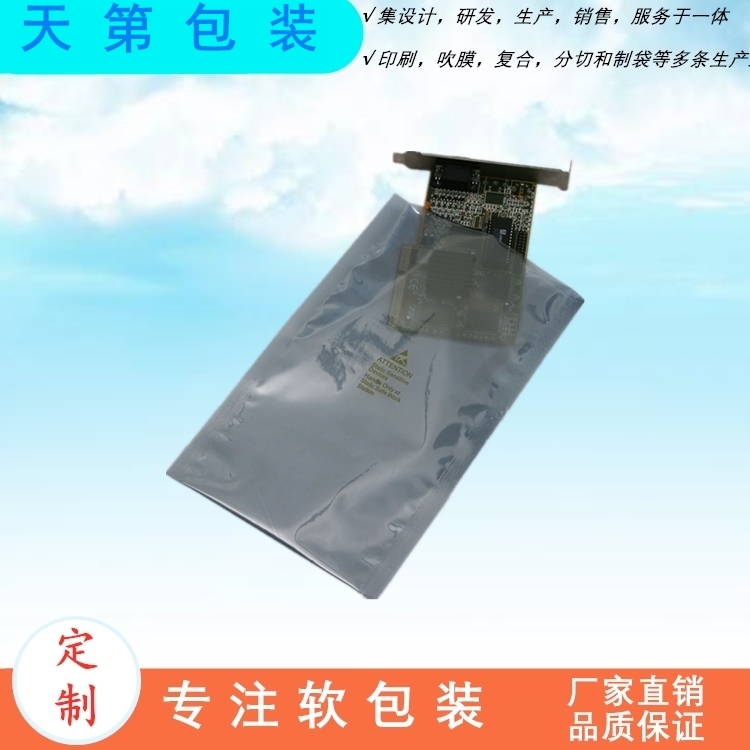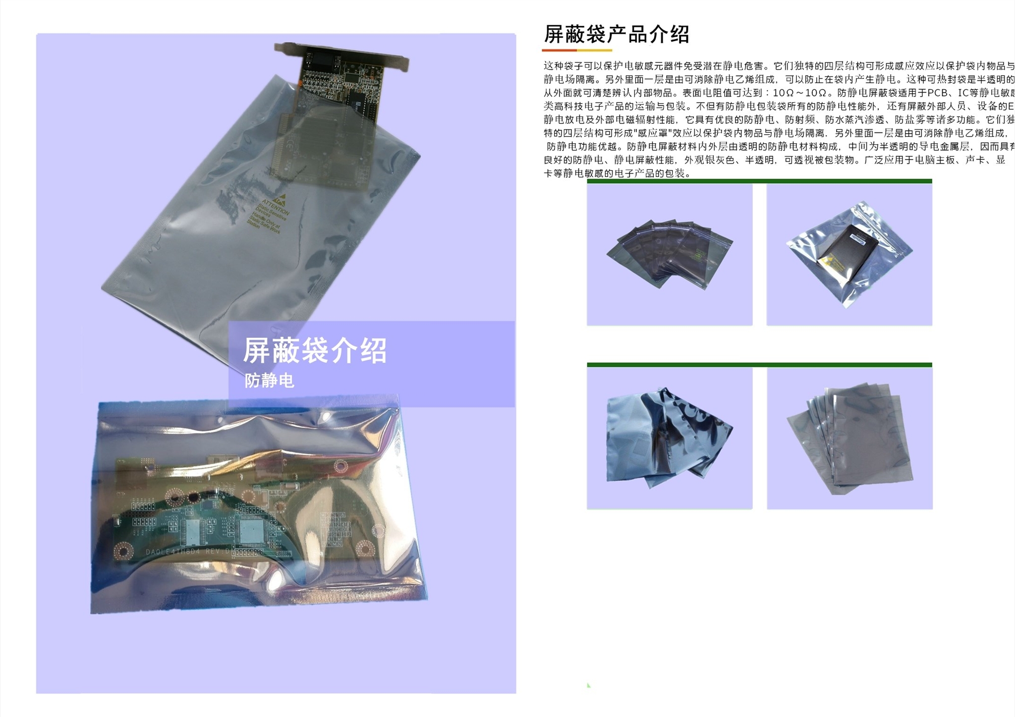 这种袋子可以保护电敏感元器件免受潜在静电危害。它们独特的四层结构可形成感应效应以保护袋内物品与静电场隔离。另外里面一层是由可消除静电乙烯组成,可以防止在袋内产生静电。这种可热封袋是半透明的,从外面就可清楚辨认内部物品。表面电阻值可达到:10Ω~10Ω。防静电屏蔽袋适用于PCB、IC等静电敏感类高科技电子产品的运输与包装。不但有防静电包装袋所有的防静电性能外,还有屏蔽外部人员、设备的ESD静电放电及外部电磁辐射性能,它具有优良的防静电、防射频、防水蒸汽渗透、防盐雾等诸多功能。它们独特的四层结构可形成"感应罩"效应以保护袋内物品与静电场隔离.另外里面一层是由可消除静电乙烯组成, 防静电功能优越。防静电屏蔽材料内外层由透明的防静电材料构成,中间为半透明的导电金属层,因而具有良好的防静电、静电屏蔽性能,外观银灰色、半透明,可透视被包装物。可制作平口袋、拉链袋、风琴袋、立体袋等形式。广泛应用于电脑主板、声卡、显卡等静电敏感的电子产品的包装;