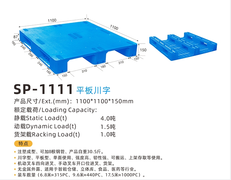 3、单面使用:托盘采用平板川字结构,单面可用。