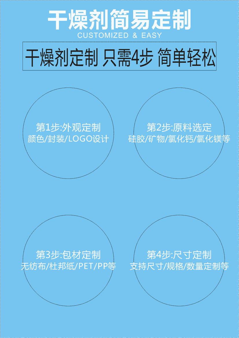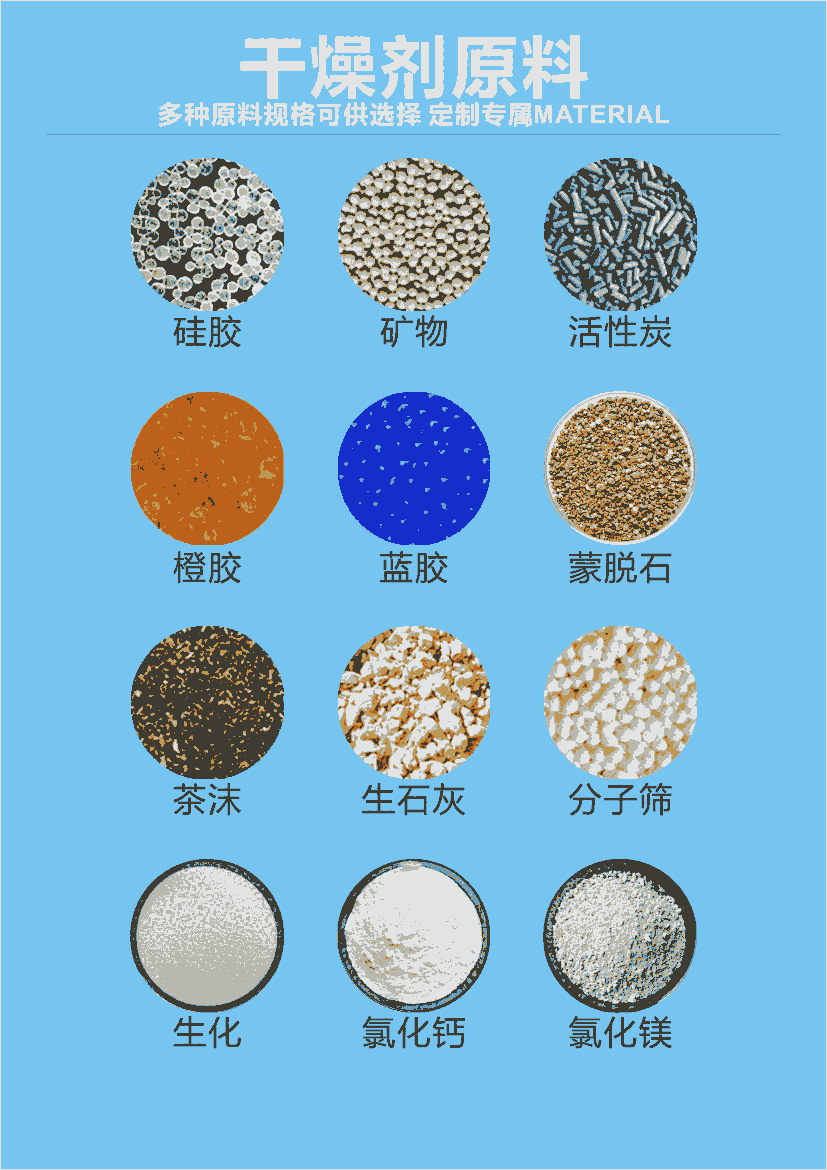 种类:硅胶干燥剂,氯化镁,氯化钙,活性炭干燥剂,柱状干燥剂、纳米矿晶 生化干燥剂 蒙脱石干燥剂,矿物干燥剂,防霉片,防霉剂等。