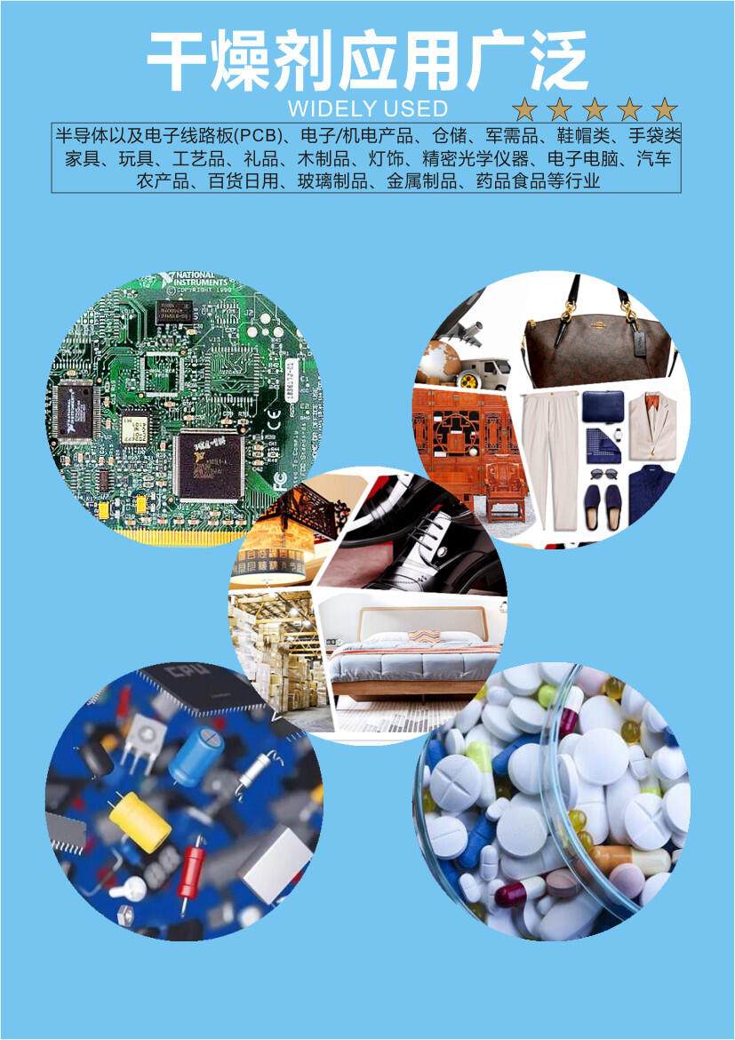 干燥剂广泛用于五金,灯饰,箱包,皮具,鞋业,食品、药品、电子产品、家用电器、工艺品、仪器、仪表、服装、鞋帽等产品的储存和运输中控制环境的相对湿度、防止物品受潮、霉变或锈蚀。