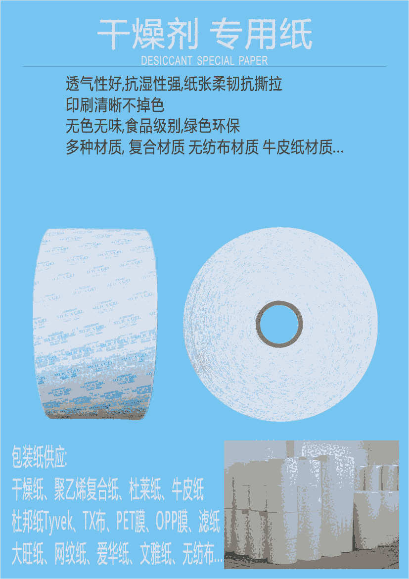 包装材质:干燥纸、聚乙烯复合纸、杜莱纸、杜邦纸Tyvek、TX布、PET膜、OPP膜、大旺纸、网纹纸、爱华纸、文雅纸、无纺布等。