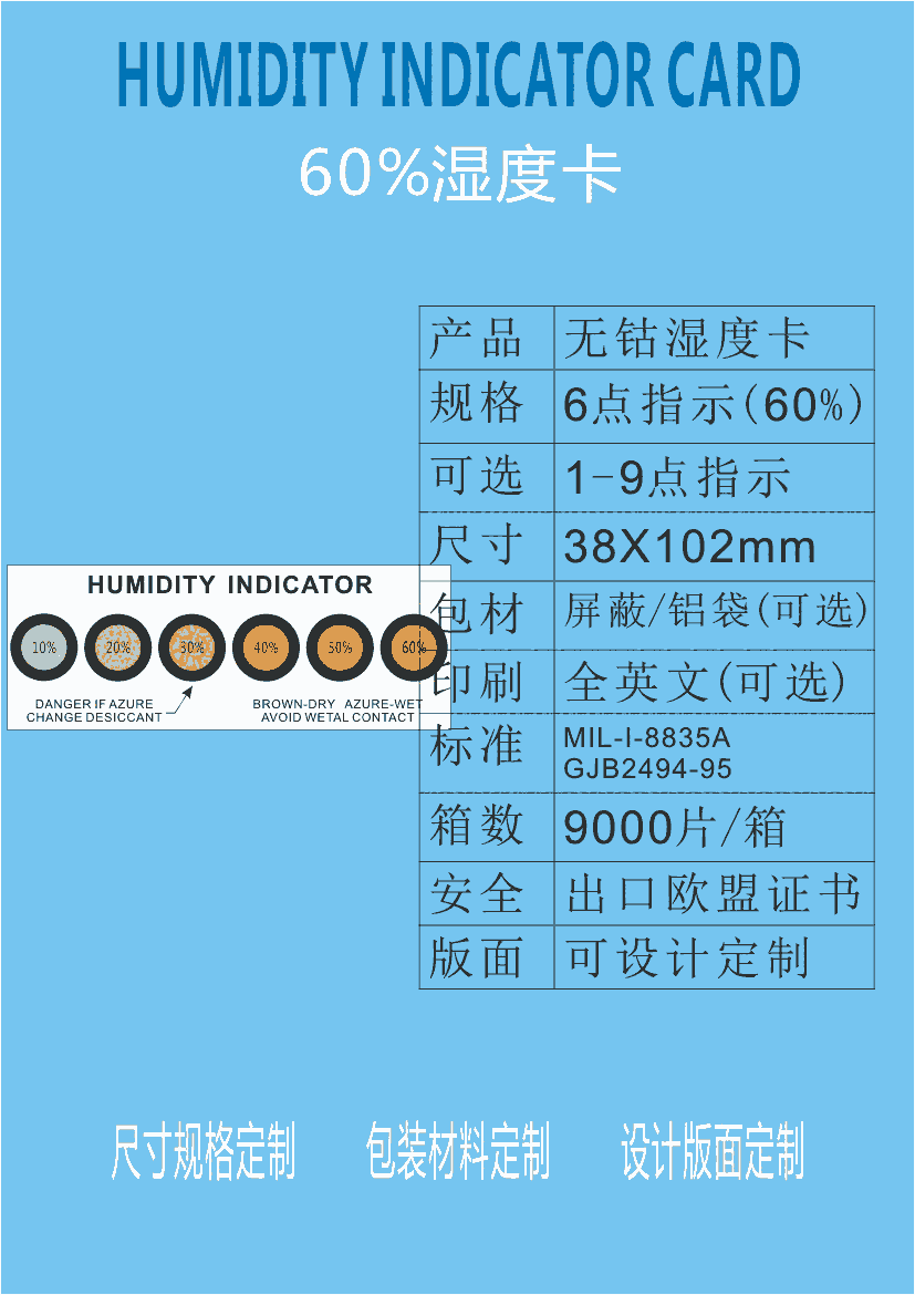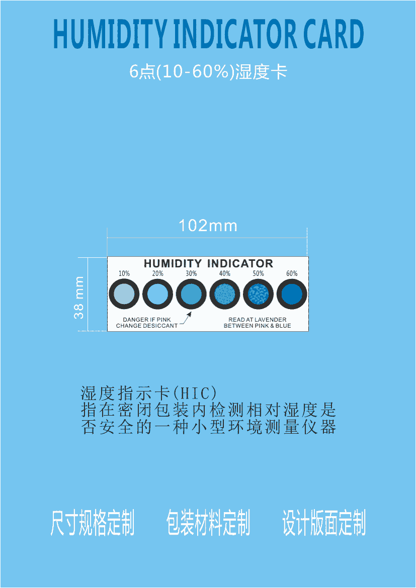 湿度显示卡(湿度显示卡,湿度卡,Humidity Indicator Card, HIC)是用作显示包装内部的环境湿度. 同时亦可确定包装内的干燥剂能否有效地保持包装内的低湿度,以防止产品受潮。湿度显示卡配合本司高效干燥剂及防静电屏蔽袋使用更佳,广泛用于半导体及电子产品的包装套装。