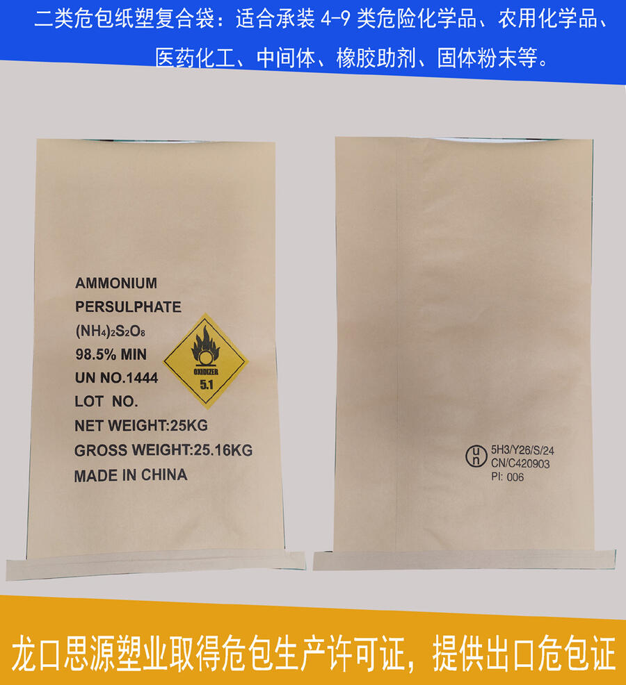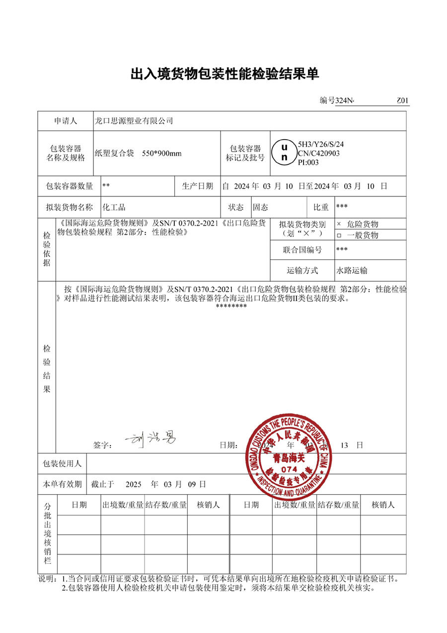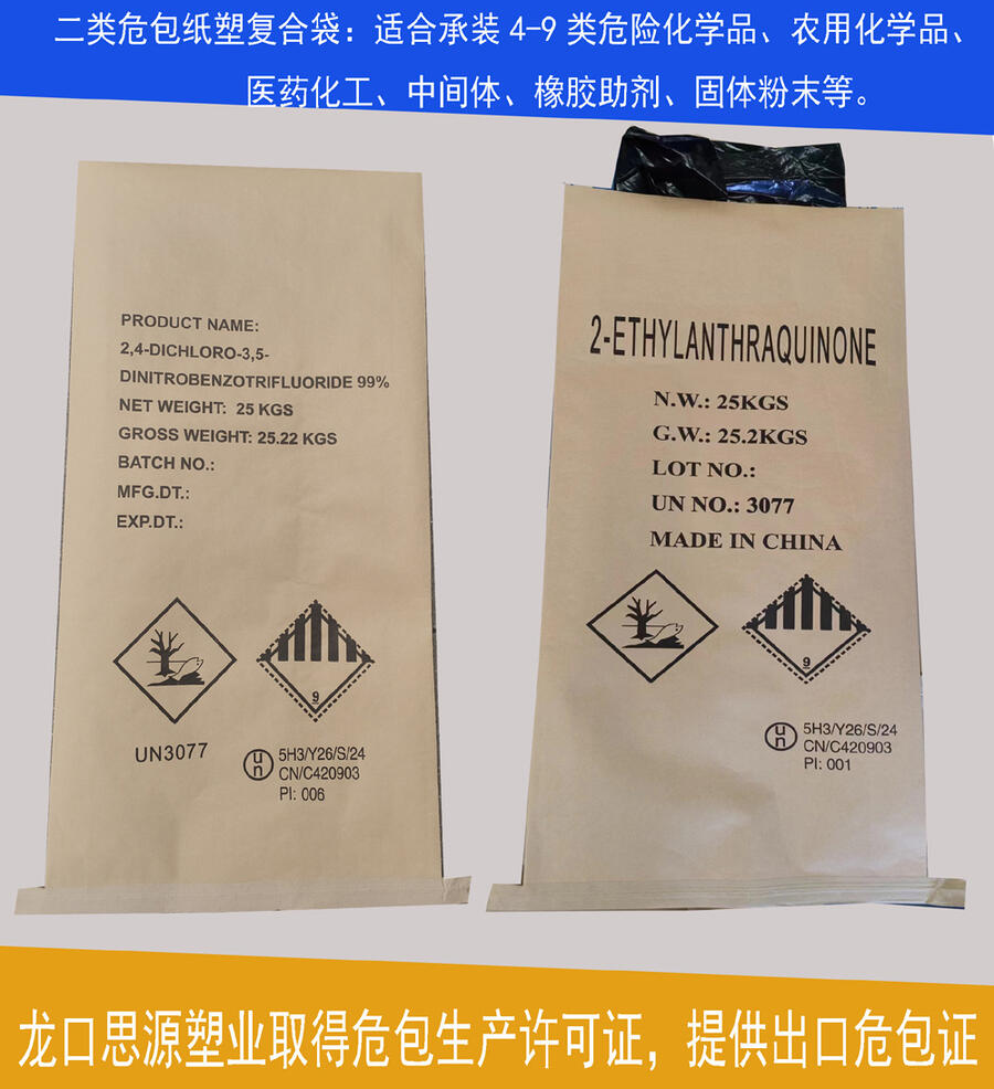 龙口思源塑业有限公司主营吨袋、纸塑复合袋、复合编织袋、塑料袋、纯牛皮纸袋。公司取得食品包装、危险品包装全国工业产品生产许可证,并由烟台龙口市出入境检验检疫局颁发“出口危险货物包装生产企业分级”、“出口食品包装备案书”,可以出具危险品、食品包装性能证。公司能私人定制化工出口危险品包装袋,提供危包出口性能单,危包出口商检单,危包生产许可证等,满足客户出口和内销需求。