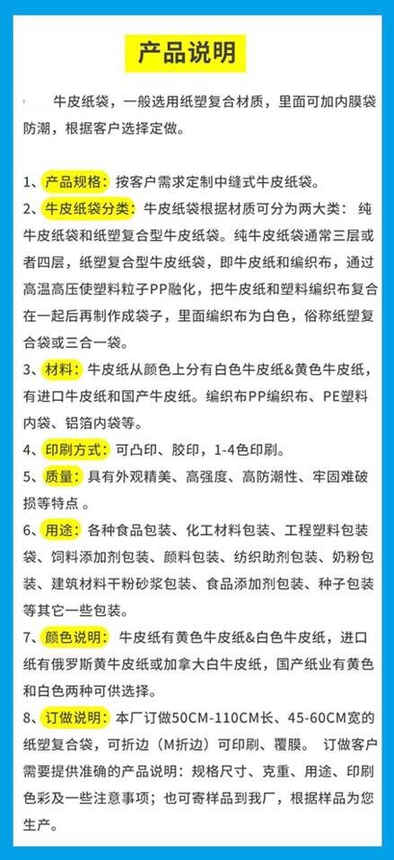 我们可生产2—4层纯牛皮纸袋, 通常采用黄牛皮纸或白牛皮纸,黄牛皮纸是纯木浆材料,白牛皮纸是进口牛皮纸,都是目前国际行的环保包装之一。主要用于包装隔热、隔气、防潮、防水要求不高的粉状或粒状的固体物料及柔性物品。