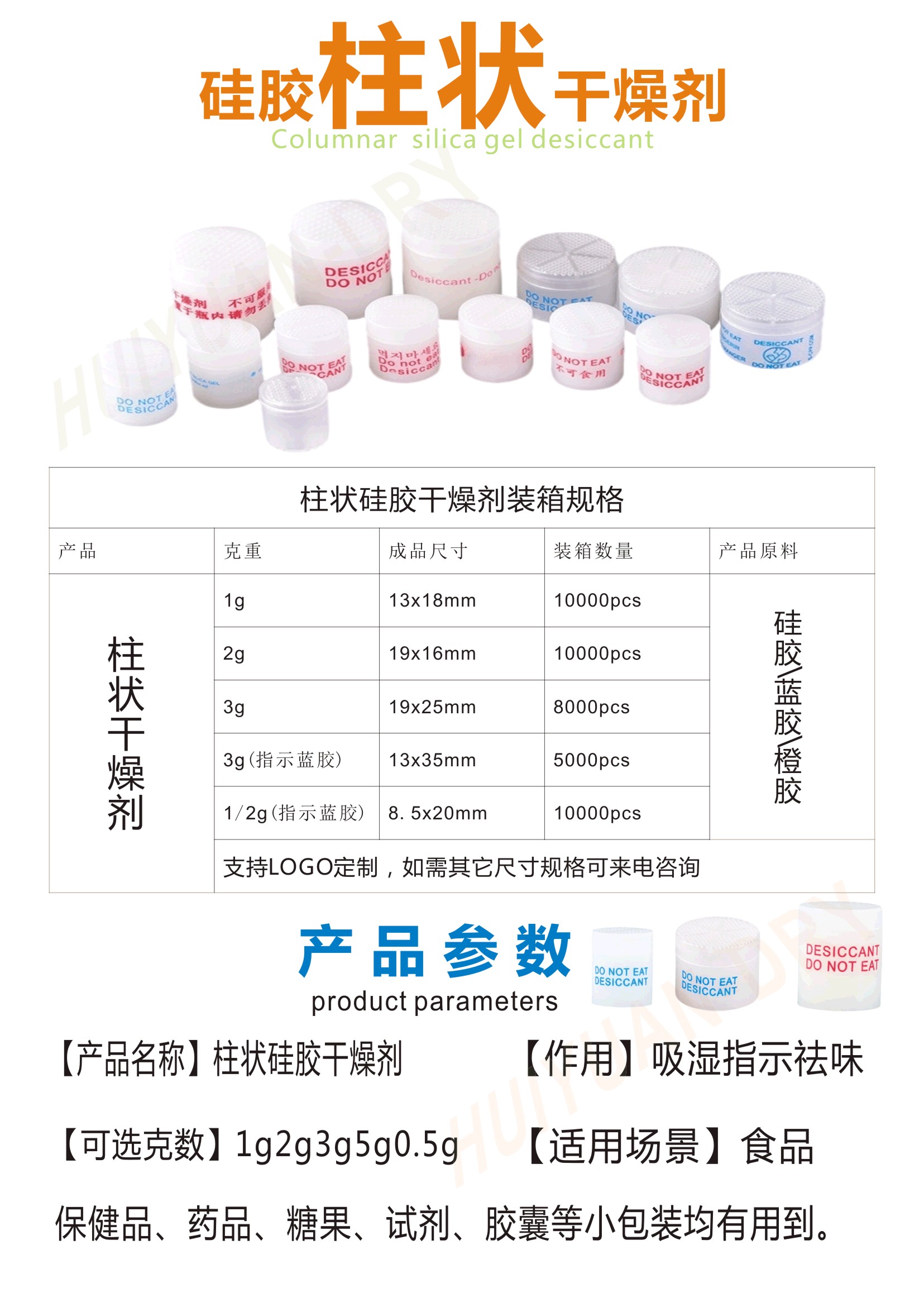 柱状硅胶干燥剂是由一小粒一小粒的干燥剂制成的柱粒状干燥剂,是将单粒干燥剂组合用于自动化技术包装的一种干燥剂。与传统式单包干燥剂手工制作投包对比,柱粒状干燥剂是专业用于设备化全自动投包,能合理的节省人力成本,提升 包装高效率,是药物、保健产品和食品企业一种新的包装发展趋势。