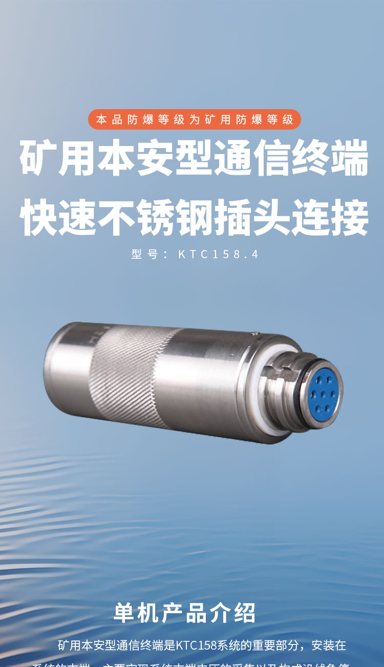 KTC158.4矿用本安型通信终端(以下简称终端)适用于煤矿井下有甲烷和煤尘爆炸性气体的环境下,作为装置中通信控制线终端的检测部件,以保证系统安全可靠的工作。