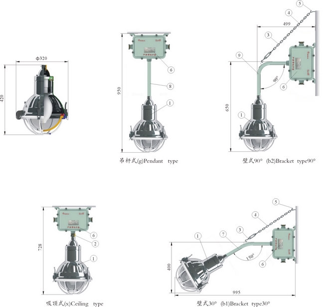 2. 采用扣合式快速开启结构,更换灯泡方便,密封可靠,具有较强的防水、防尘、防腐功能。