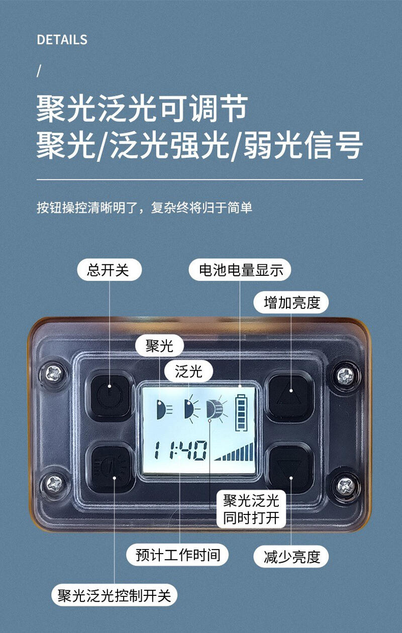 ◆功能多样:灯具功能多样,更具人性化。集聚光/泛光照明、电量显示、无极调光、信号警示等功能,满足用户不同环境下使用的需求采用标准USB充电接口,可为大部分手机等数码产品充电,解决用户在户外作业时手机或其他数码产品电量用尽无法使用的烦恼;