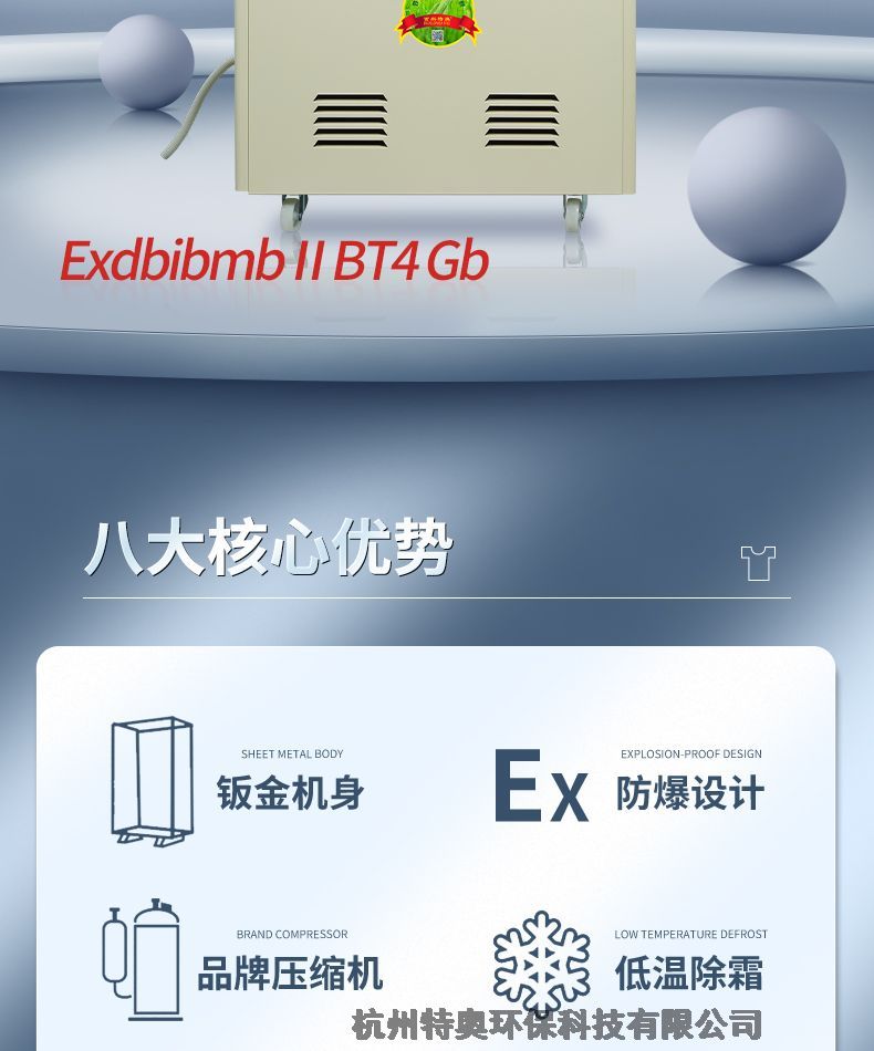防爆措施:除湿机内的电器元件、电气控制部分及风扇电机均采取专用的防爆结构处理(隔爆型),电磁阀、压缩机出线及高低压压力开关采用浇封型,操作面板及管温、环温传感器等均采用其独有的本质安全型,防爆要点可靠突出。