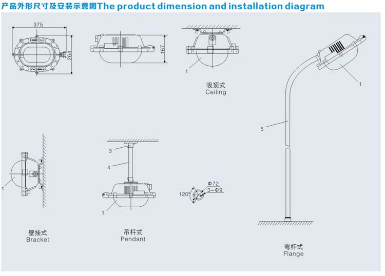 5、安装方式 重量轻,可选用吊杆式、壁挂式、吸顶式和灯杆式等多种安装方式,操作简单方便。