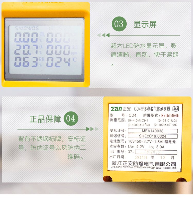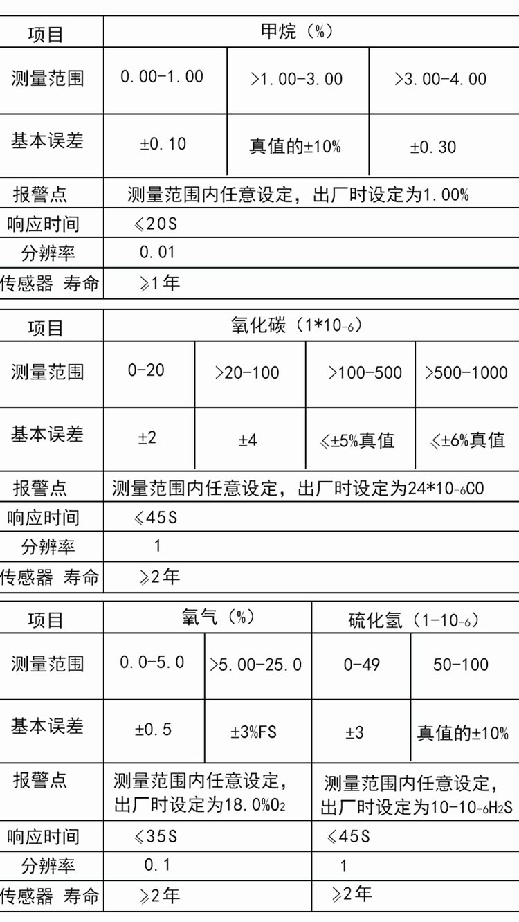 测量范围 | 甲烷,氧气,一氧化碳,硫化氢 | ||