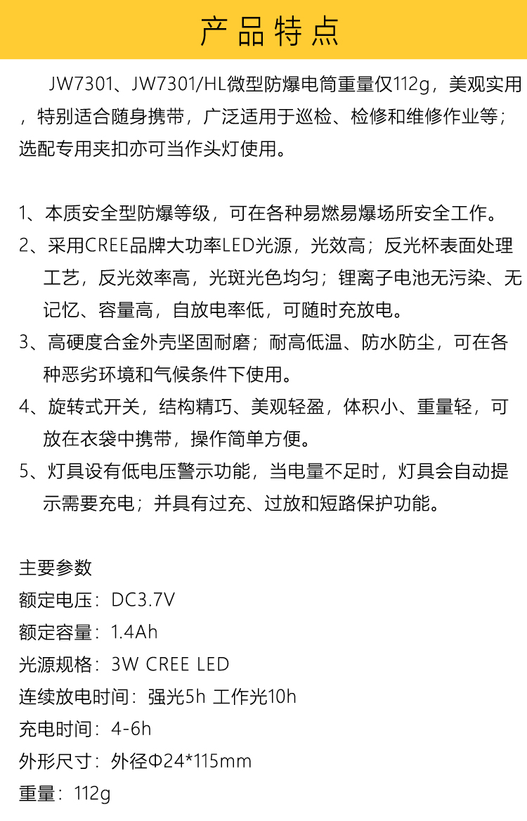 JW7301/HL微型防爆电筒 JW7301 1W Ex ib IIC T4 Gb袖珍防爆手电筒 是否支持加工定制 | 是 | ||