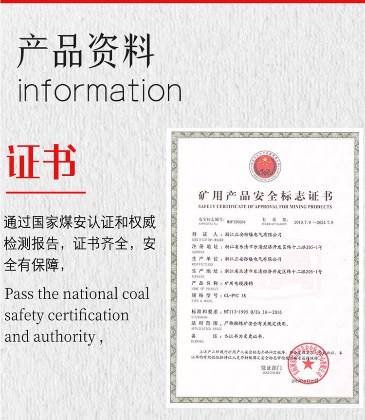 浙江正安防爆电气有限公司是一家专门经营和生产矿用电气设备、仪器的有限责任公司,公司具备了一支较强的专业技术队伍,并与国内有关煤炭科研院所建立了密切的合作关系,已开发出了矿山照明灯具、气体检测仪器、矿山自救装备、矿山通信设备、综保开关插件、矿山测量仪器、电气转接配件、监控套产品等八大类的几十个新产品.欢迎客户及社会各界人士来我司莅临参考指导,我司地址浙江省乐清市经济开发区纬十二路205-1号,联系方式15057371320