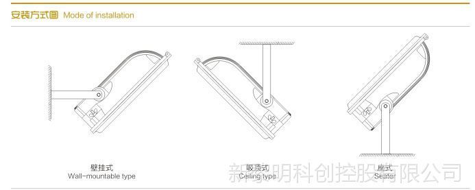 4、安装方式:壁挂式和吸顶式等多种安装方式,照射角度可根据需要在上下25°范围内任意调节。可根据现场需要适配φ10~4mm不同线径的电缆,并可实现多灯并连使用,适合布局工程照明。电子、机械双重保护装置,开盖后自动切断电源,使用维护更加