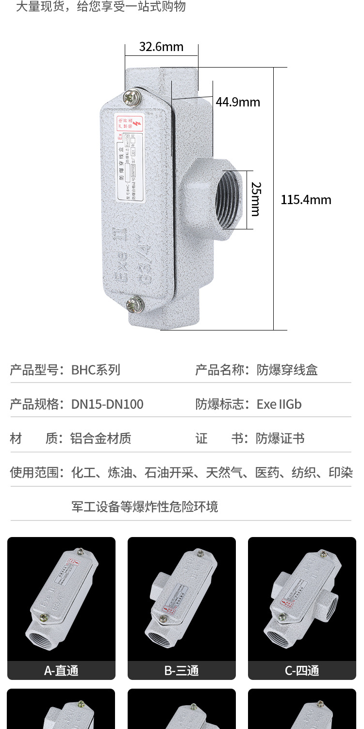 BHC三通铸铝DN20防爆穿线盒G3/4钢管布线专用盒 使用环境 | 22区 | ||