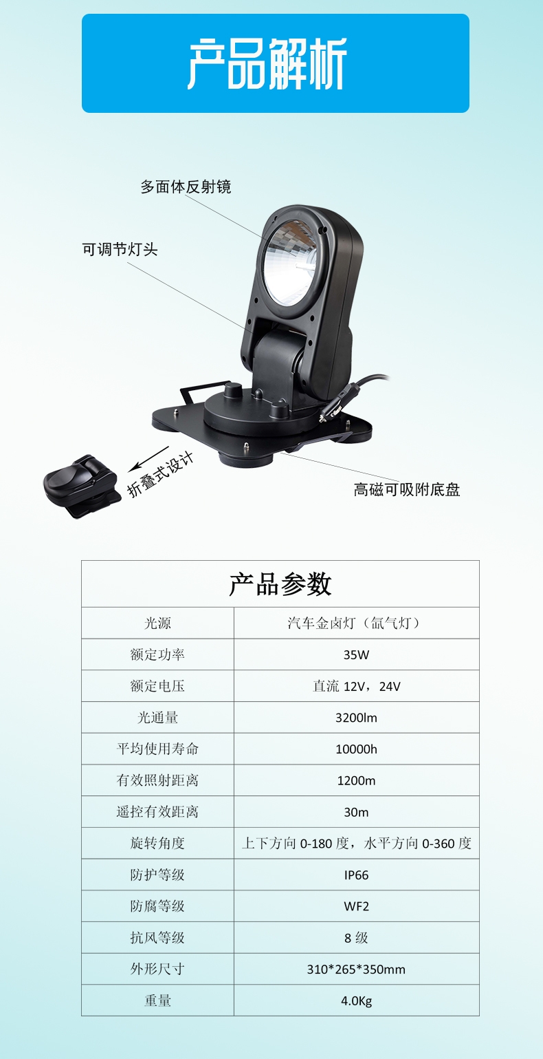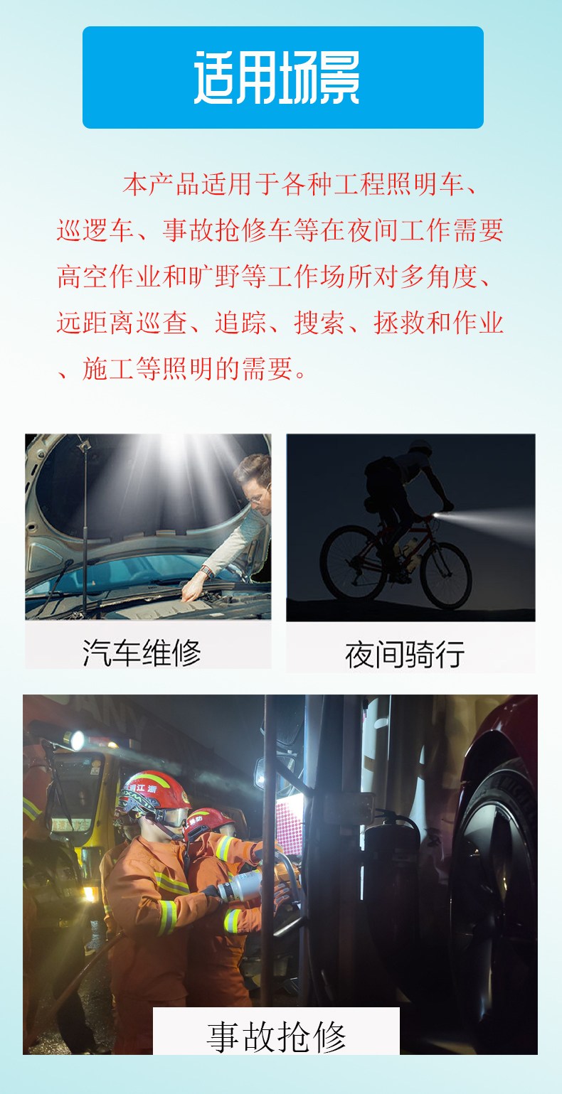 灵活多样:底盘装有强力吸磁石,可将吸附在汽车、船舶上移动照明。进口防弹胶材料外壳可承受强力冲击,紧密的结构设计确保在高频振动下或暴雨环境中均能正常使用。