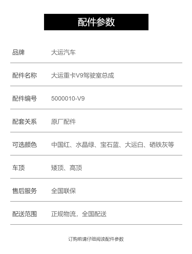 配件名称 | 大运重卡V9驾驶室总成 | ||