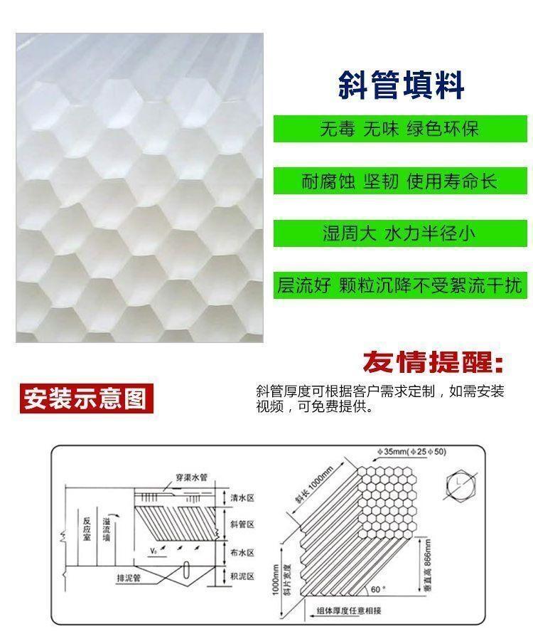 蜂窝斜管填料主要有聚丙烯塑料斜管和聚材质斜管,斜管长度大沉淀效果好,实验证明,在斜管进口一段距离内,泥水混杂,水流紊乱,污泥浓度也比较大,此段成为过渡段或紊乱段,该段以上可看出明显的泥水分离,此段为分离段,但是斜管也不易过长,斜管过长的情况下会增加造价,效果也不会明显。因此蜂窝填料长度适中即可。pvc蜂窝斜管-