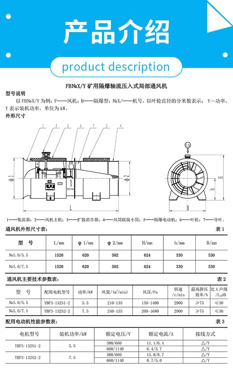 矿用隔爆型压入式轴流局部通风机FB№5.0/7.5 单电机7.5KW防爆 是否支持加工定制 | 是 | ||
