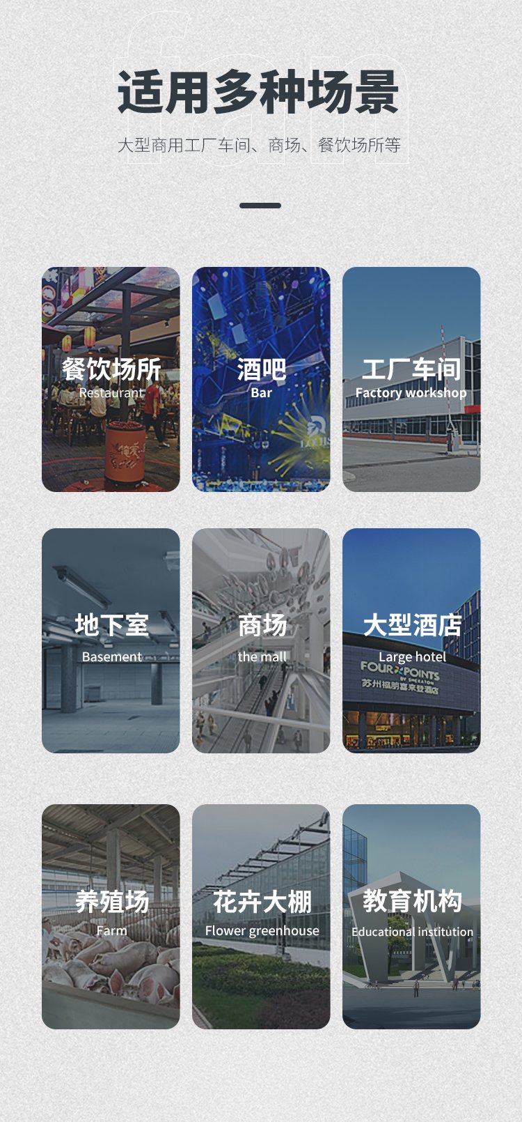 用途:宾馆、饭店、礼堂、影剧院、地下室、厂矿企业的车间、办公楼与需要通风换气的场合使用。