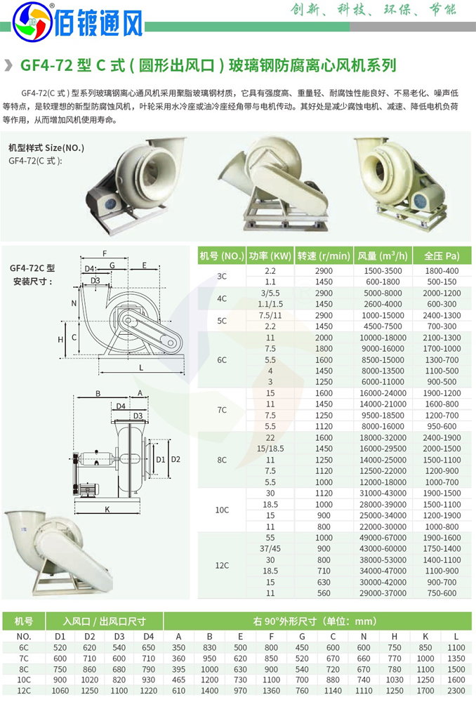 GF4-72C(圆口)型玻璃钢离心通风机是参照金属4-72型通风机性参数而采用玻璃钢复合材质制作而成。该系列风机可输送含酸碱成分及化学成分的腐蚀性气体。所输送气体不允许含有粘性物质、所含粉尘及硬质颗粒≤150mg/m3、气体温度≤60℃、相对湿度≤100%.该系列风机具有强度高、重量轻、不易老化、耐腐蚀性能良好、噪音低、运转平稳等特点。是一种较为理想的通用型防腐风机。该系列风机广泛应用于化工、电镀、氧化、发电厂、化验室、线路板、环保设备等含有腐蚀性气体的场所。