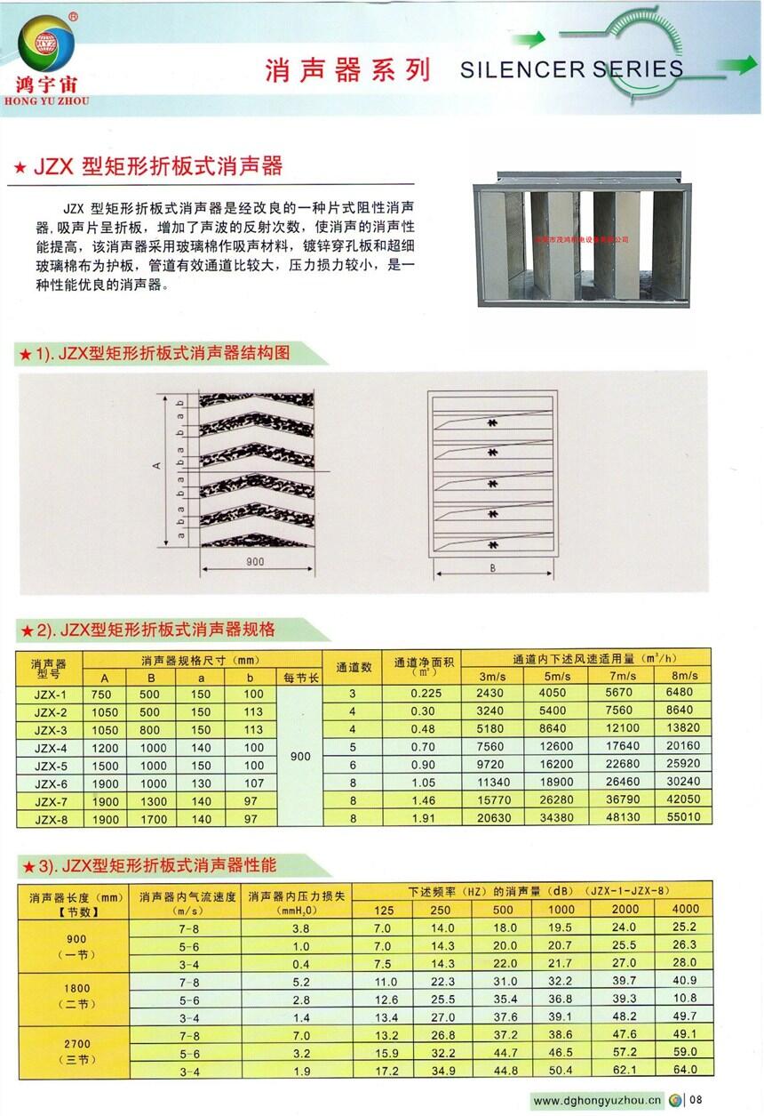 JZX型矩形折板式消声器时经改良的一种片式阻性消声器,吸声片呈折板,增加了声波的反射次数,使消声器的消声性能提,该消声器采用了玻璃棉作吸志材料,镀锌穿空板和超细玻璃棉布为护板,管道有效通道比较大,压力损失较小,是一种性能优良的消声器。