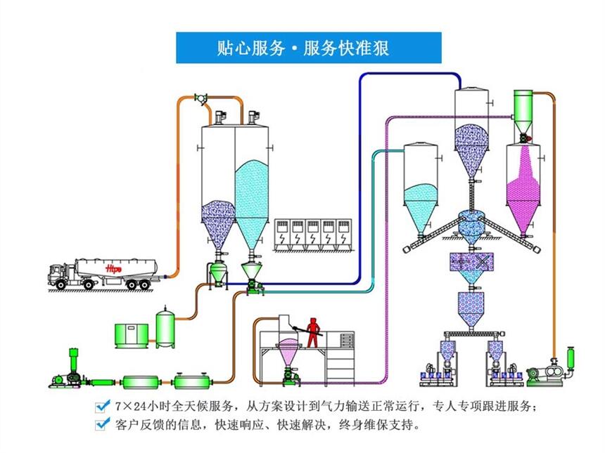 两个叶轮相向转动,由于叶轮与叶轮、叶轮与机壳、叶轮与墙板之间的间隙小,从而使进气口形成了真空状态,空气在大气压的作用下进入进气腔,然后,每个叶轮的其中两个叶片与墙板、机壳构成了一个密封腔,进气腔的空气在叶轮转动的过程中,被两个叶片所形成密封腔不断地带到排气腔,又因为排气腔内的叶轮是相互啮合的,从而把两个叶片之间的空气挤压出来,这样连续不停的运转,空气就不断地从进气口输送到出气口,这就是罗茨风机的整个工作过程。