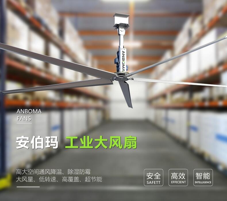 台州节能工业大风扇、丽水大型工业吊扇厂家安伯玛生产的工业大风扇通过超大扇页运转能驱使空气不断流动,形成立体循环气流,使室内与室外空气达到自然交换,消除环境空气分层。