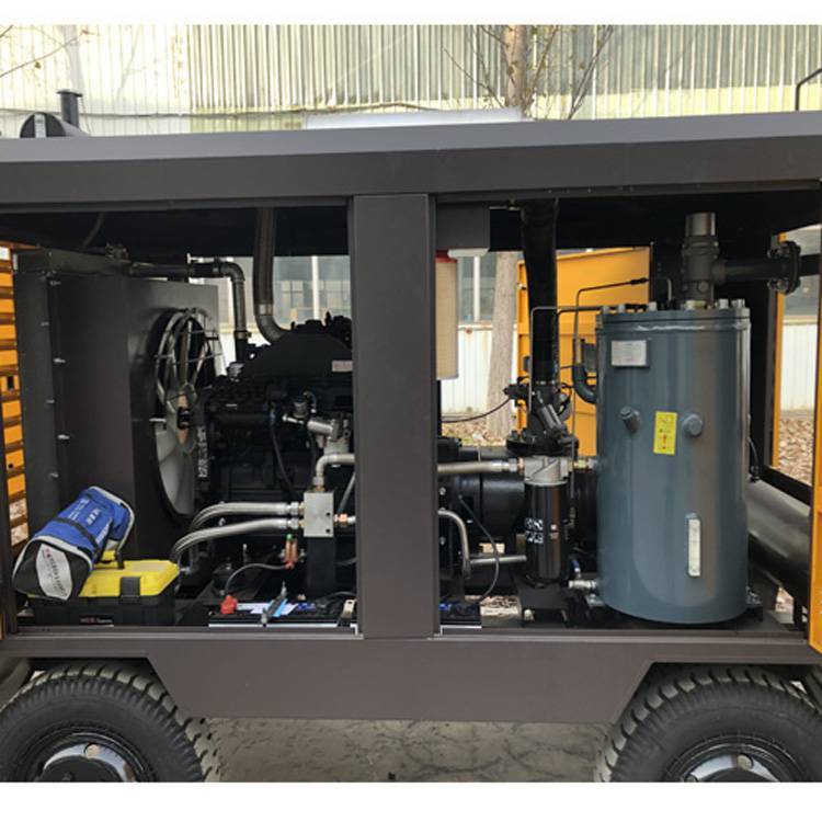 移动螺杆空压机型号:QFY-75G,驱动方式:直联,电机功率:75千瓦,排气量:13立方每分钟,工作压力:8-13公斤,外形尺寸:2850*1460*1870,重量:1800公斤,四轮移动带牵引,内部自带缓冲罐,隧道矿山钻机凿岩凿孔、护坡喷浆用螺杆空压机。