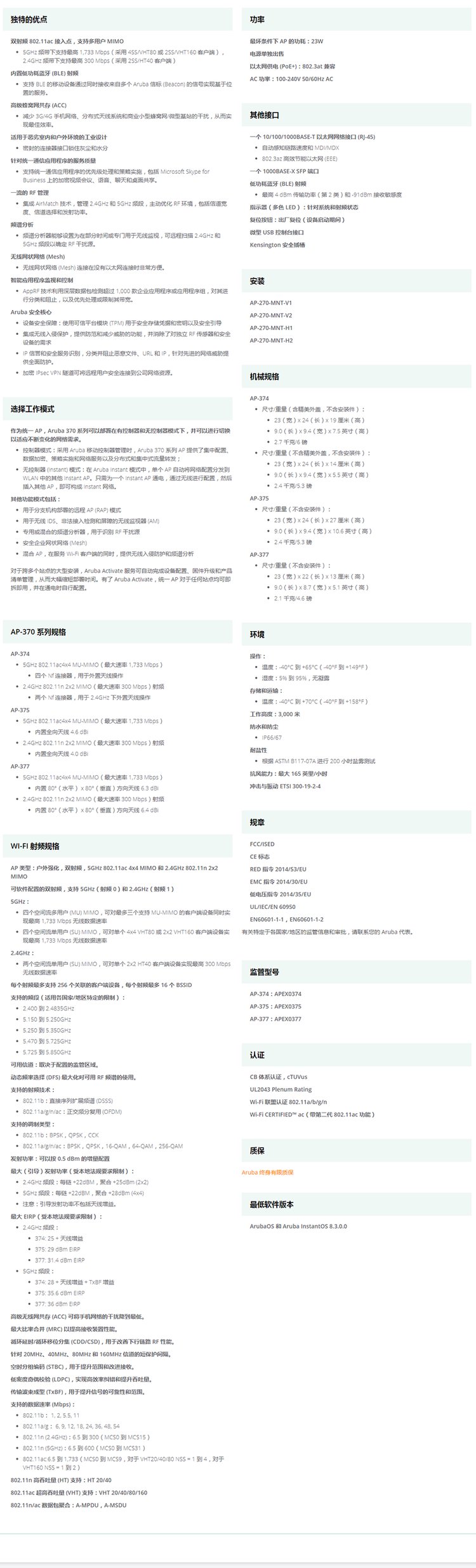 阿鲁巴Arub370系列适用于户外环境的高性能802.11ac第2代产品