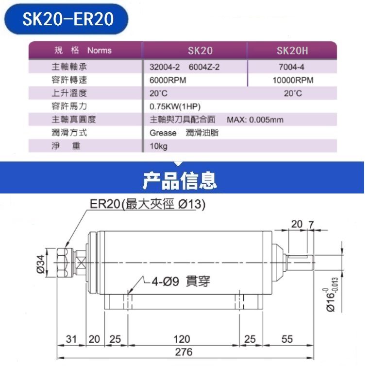 SK30-ER32/MT3/NT30/FA35,容许转速3000RPM,温升为20°C,容许马力为1.5KW(2HP),主轴真圆度跳动0.005mm-0.002mm,重量12KG.