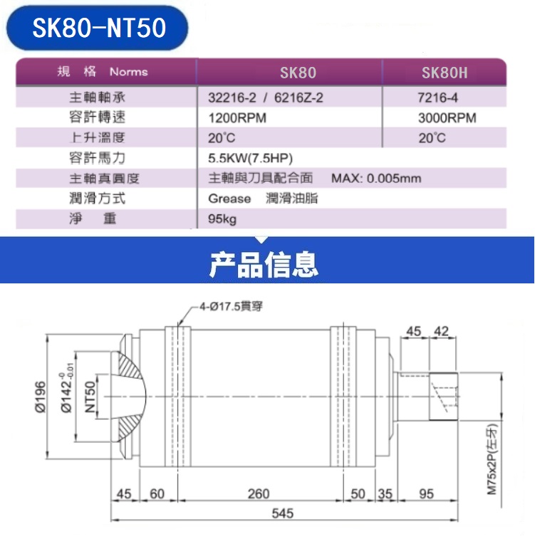 SK80-P4-NT50/FA75/MT6,容许转速3000RPM,温升为20°C,容许马力为5.5KW(7.5HP),主轴真圆度跳动0.005mm-0.002mm,重量95KG.