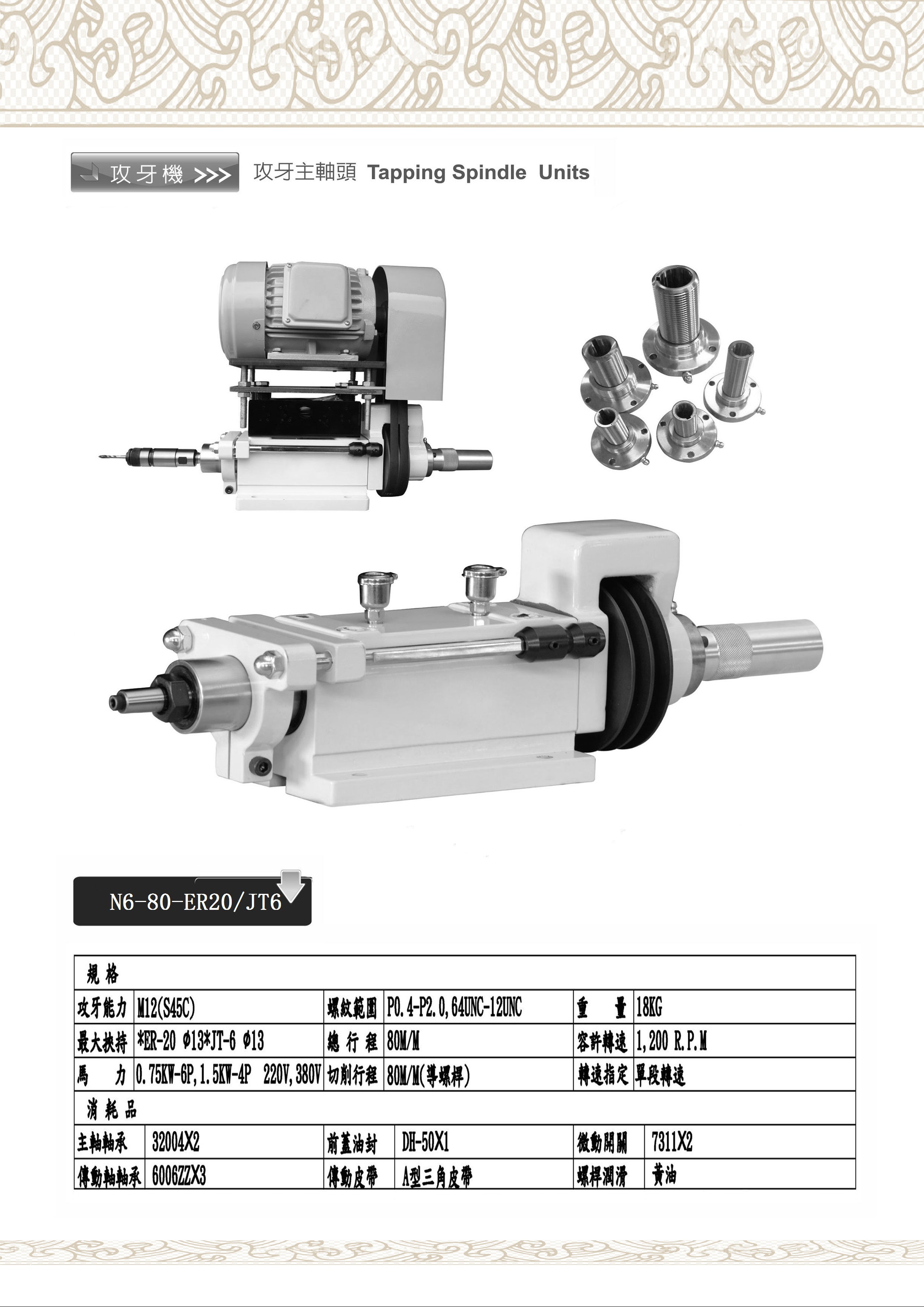 N6-80-ER20/JT6,攻牙能力M12以内(以S45C为标准),行程80mm,转速1000RPM内,重量25kg内.