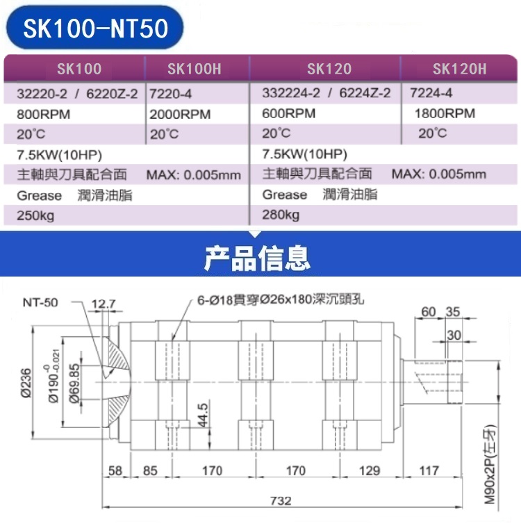 SK100H-NT50/FA75,容许转速2000RPM,温升为20°C,容许马力为7.5KW(10HP),主轴真圆度跳动0.005mm-0.002mm,重量250KG.
