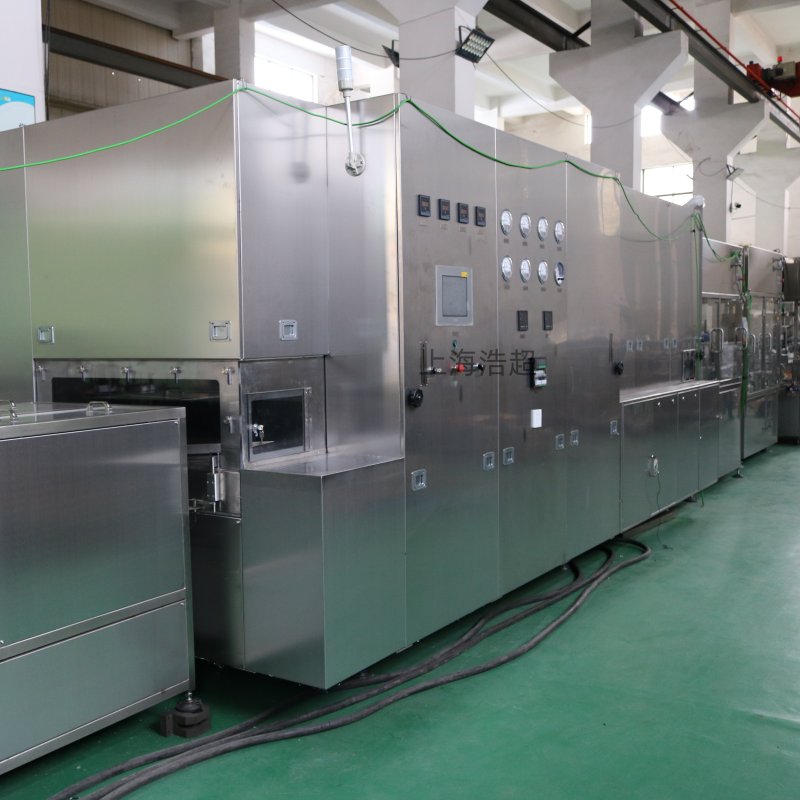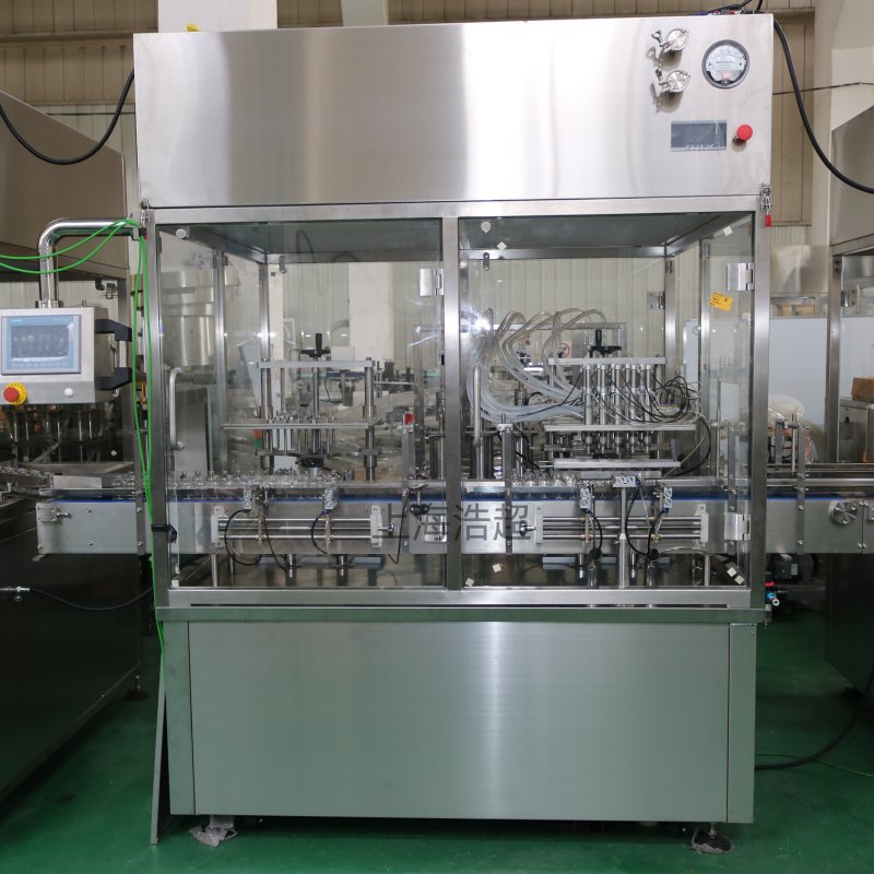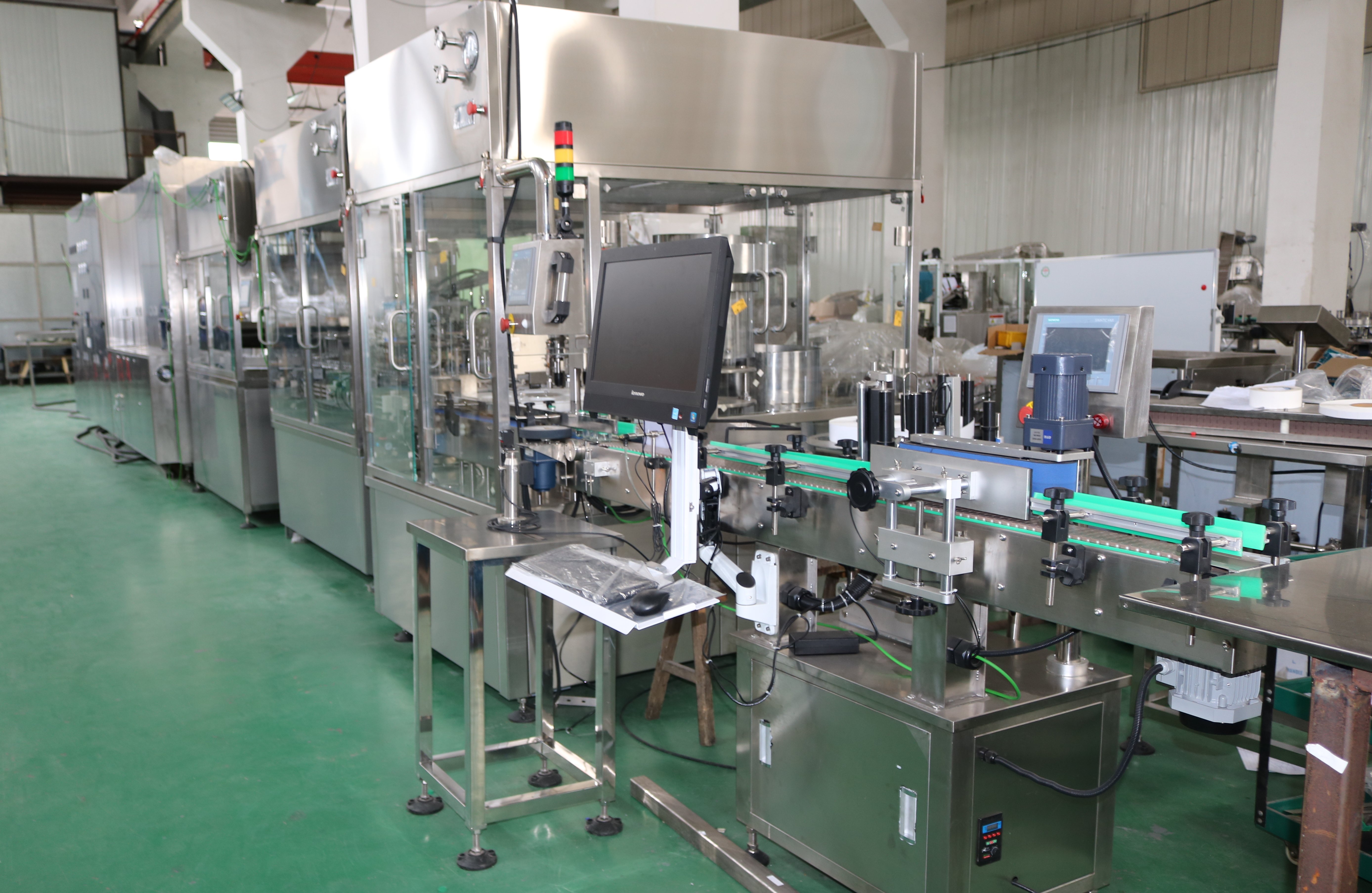 本生产线由供瓶机,滚筒式洗瓶机、烘箱、灌装加塞机、圆盘定位旋(轧)盖机组成,可完成超声波、水、气的清洗、灭菌烘干、灌装、加塞、轧盖等工序,主要用于大输液及其他小剂量溶液的联线生产,并可配以贴标机组成合理的生产线。