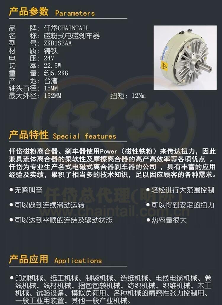 台湾仟岱有限公司中国大陆独家授权总代理仟岱磁粉离合器,仟岱磁粉刹车器ZKB2S5AA,仟岱磁粉制动器ZKB1S2AA,扭力12NM,DC24V,配合明协牌张力控制器MX02-4A使用,保持恒定张力输出。
