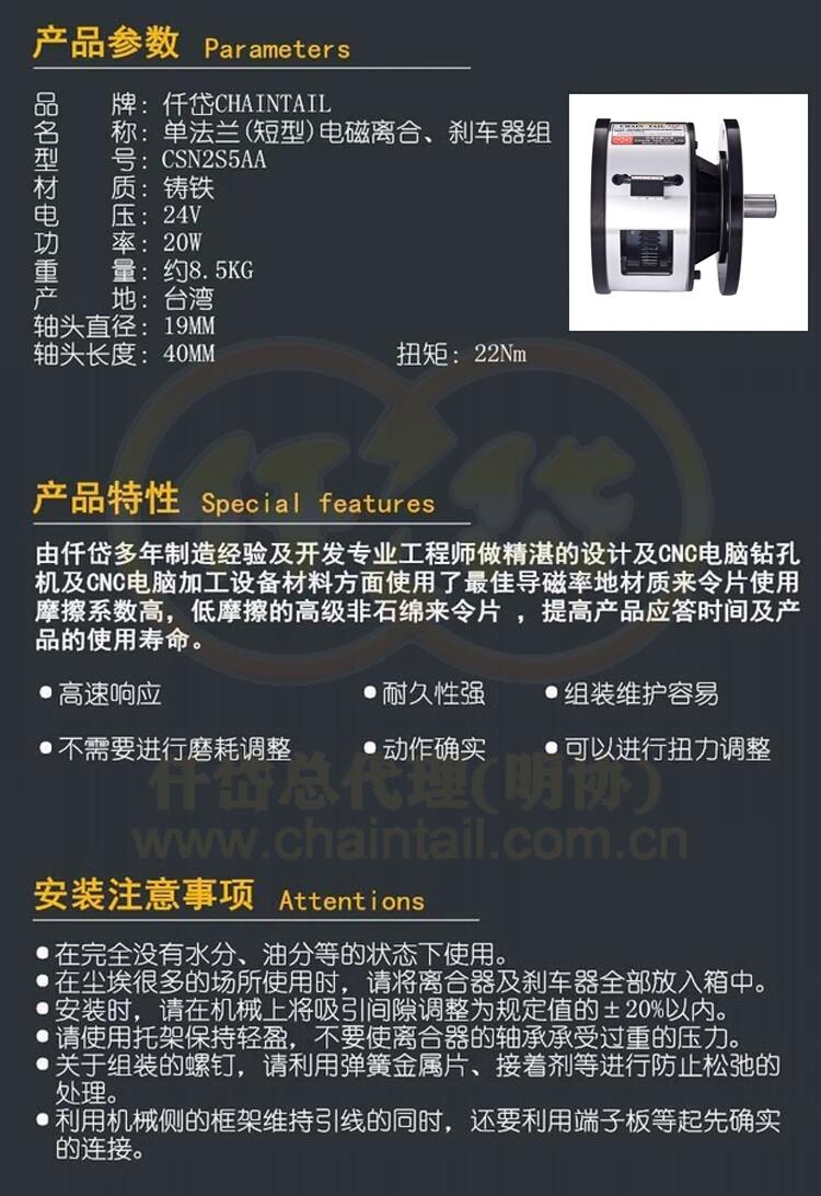 仟岱双法兰离合刹车器CSN2S5AA/上壳机离合制动器组CSN2S5AB台湾仟岱有限公司生产,中国大陆总代理13710967244余先生。广州仟岱机电设备有限公司,台湾仟岱广州分公司,中国大陆总代理。真正100%原装进口品牌,正品原装仟岱,长达32年品牌竞争力,品质优异,价实惠!专门销售代理台湾“仟岱”牌磁粉式离合器、刹车器,干式单板电磁式离合器、刹车器,电磁式离合刹车器组,湿式多板电磁式离合器、刹车器,电磁式断电刹车器,电动代步车、电动轮椅专用系列电磁式安全刹车器,自动车床专用电磁式、机械式离合器、刹车器等。 种类繁多,运用广泛,主要应用于包装、打包机械,纤维机械,金属加工机械,自动车床工作机械,输送、搬运机械,印刷、纸用机械,木工机械,事务机械,测量、绕线机械,食品机械以及其它非标机械等自动化设备。