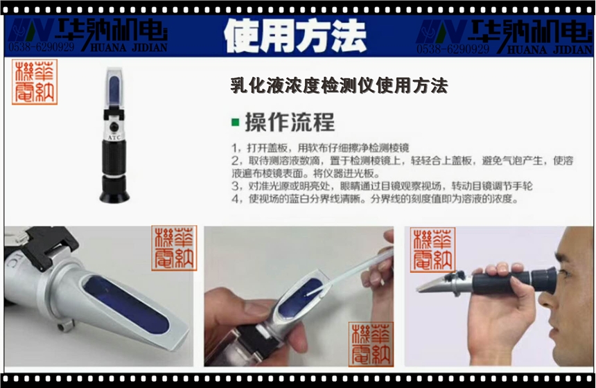 产品用途:乳化液浓度计/乳化液浓度检测仪主要用于机械加工行业冷却降温的乳化液及矿山通用的 M-10 , MDT 乳化液的重量百分比浓度的配制及检测,为安全,经济的配制乳化液提供了便捷的方法,广泛应用于机械加工,矿山采选,井下支护等领域。