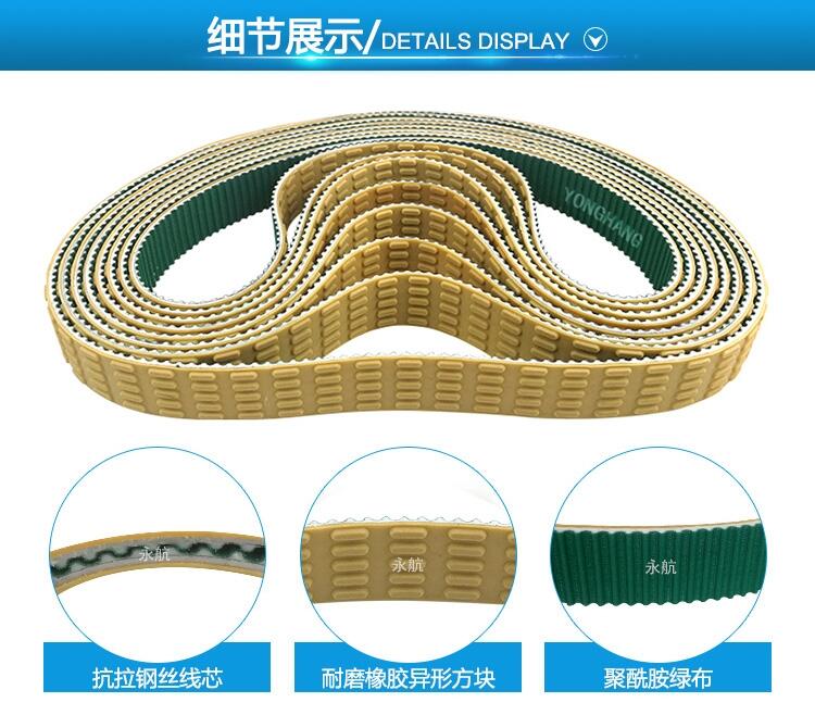 剪节机皮带用于香肠剪节机、灌肠机、扎线机等食品输送设备,永航剪节机皮带由热塑型聚氨酯材料制成,底带可做接驳带或无缝带,采用进口钢丝线芯(也可做进口凯夫拉线芯)为抗拉层,表面加橡胶异形方块,具有高耐磨性 耐油 抗老化 抗腐蚀等特点。齿面可根据要求加聚酰胺绿布,降低摩擦系数和噪音。剪节机皮带T5/T9专用特殊齿形都可以做,齿形饱满,传动精准 效率高,支持定制,并提供12个月的免费售后服务和技术支持!