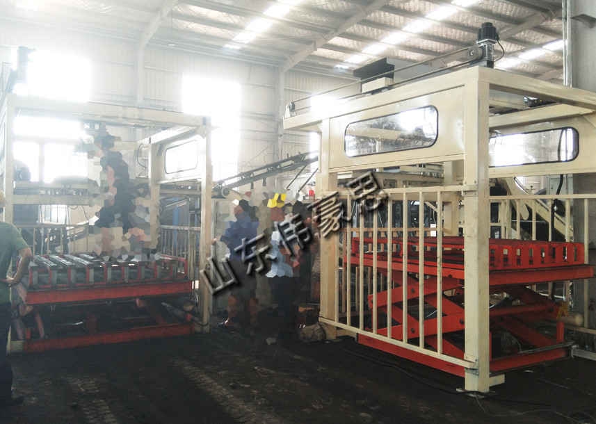 (6)托盘库。成叠的托盘由叉车送人,按程序逐个排放至托盘辊道输送机,有规律地向码垛工序供应空托盘,由辊道输送机输送至成垛托盘库,然后由叉车取出送至仓库贮存。