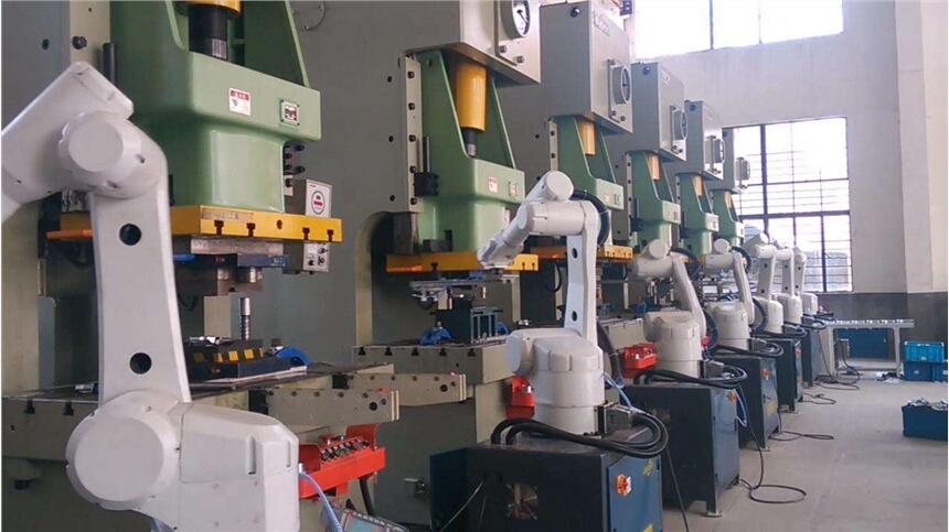 有些冲压机械手采用的是国际先进的高速紧凑型冲压线,冲压机械手能快速提高冲压机的生产效率。板料对中采用当今先进的光学摄像系统进行定位。拉伸压力机选用数控液压拉伸垫,先进的每个自动化单元配一个机械手臂,省去了穿梭传送装置,缩短输送距离,减少压力机的间距,冲压机械手生产节拍可达15件/min。