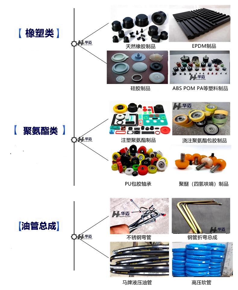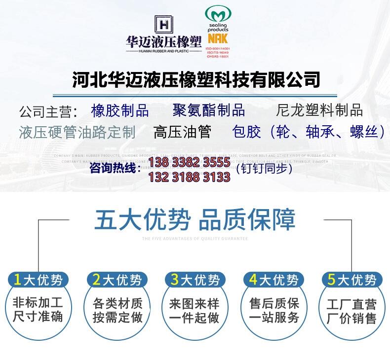 河北华迈液压橡塑科技有限公司是以开发生产各类橡胶制品,聚氨酯制品 及硬管油路,胶管总成,尼龙塑料等制品的非标产品供应商。有大型硫化机,注塑机,浇注机,精密折弯机等设备生产橡胶等设备。各种橡胶制品,V型包胶轮聚氨酯注塑加工 及聚氨酯产品,硬管油路,液压泵站,金属胶轮,尼龙件, 高压钢丝编织胶管,液压油缸等另有大型浇注机生产橡胶、聚氨酯、带螺杆橡胶减震墩 牛筋胶等制品等垫圈 减震块 异形件 密封件,包胶轴承,硅胶板,橡塑条等金属包橡塑 包胶轮等. 华迈液压橡塑可为广大行业用户定制异形橡塑产品,非标尺寸的油路总成等;愿我们真诚合作.共创辉煌。