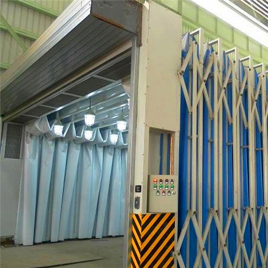 3、伸缩移动喷漆房整体为框架传动结构,每组框架间均有阻燃PVC布密封连接,安装快捷、外形美观,结构精巧,使用方便,制造成本低,节约投资;