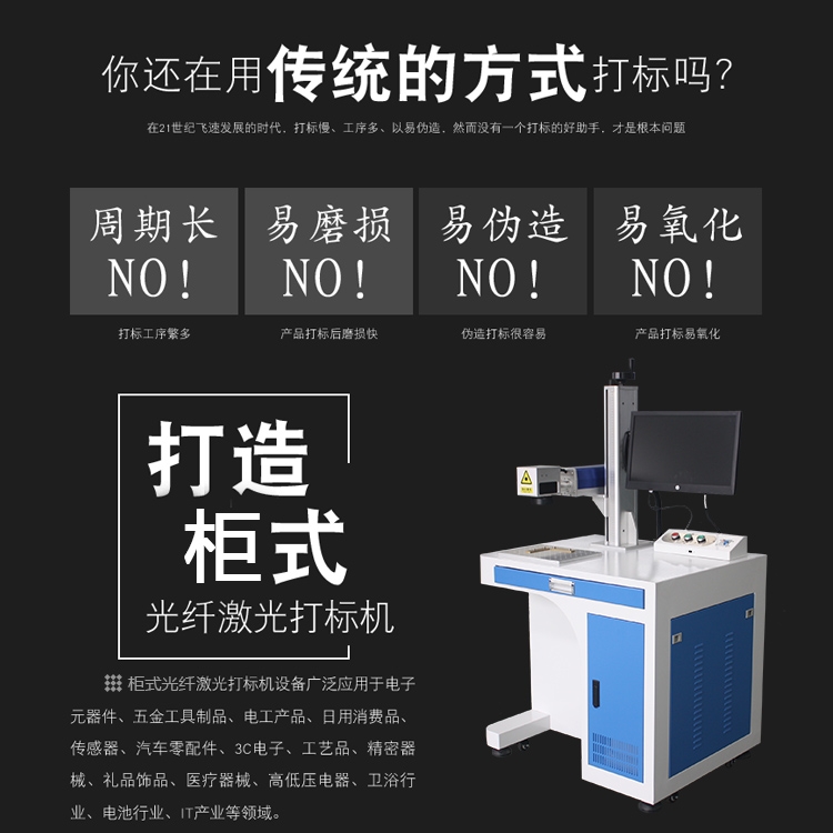 机型特点:自带刻度标尺,达标定位简捷精准;大幅工作台面,可实现大范围内连续不间断打标。光纤激光标记系统采用一体化设计,体积小,功耗低,长寿命,高效率,具有高质量的激光束,光斑精细,不需耗材。光纤打标机,扫描振镜密封性好.防灰尘,体积小,紧凑坚实,性能优越的伺服电机,动力卓越。打标机软件及控制卡USB接口,传输快速,稳定,具有模拟,数字传输功能,软件操作简单,功能强大。