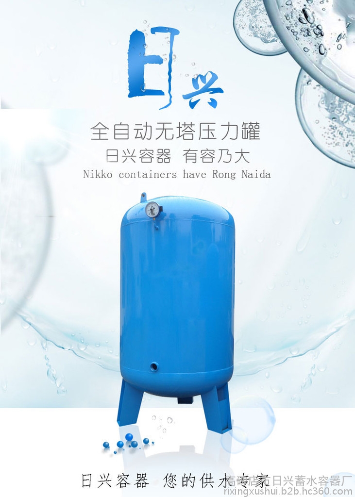 压力罐:无塔供水器采用动力设备汲取水到无塔供水容器内,利用空气压缩的原理,形成自然压力,从而实现水资源全封闭存储,增压,输送等全自动供水功能,具有全自动控制,可移动无污染,造价低,寿命长等优势,完全替代了成本高昂,大兴土木的高价水塔和敞开式房顶水塔,实现了供水自动化,智能化。