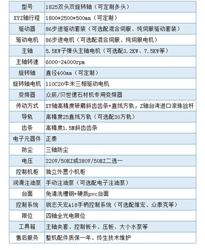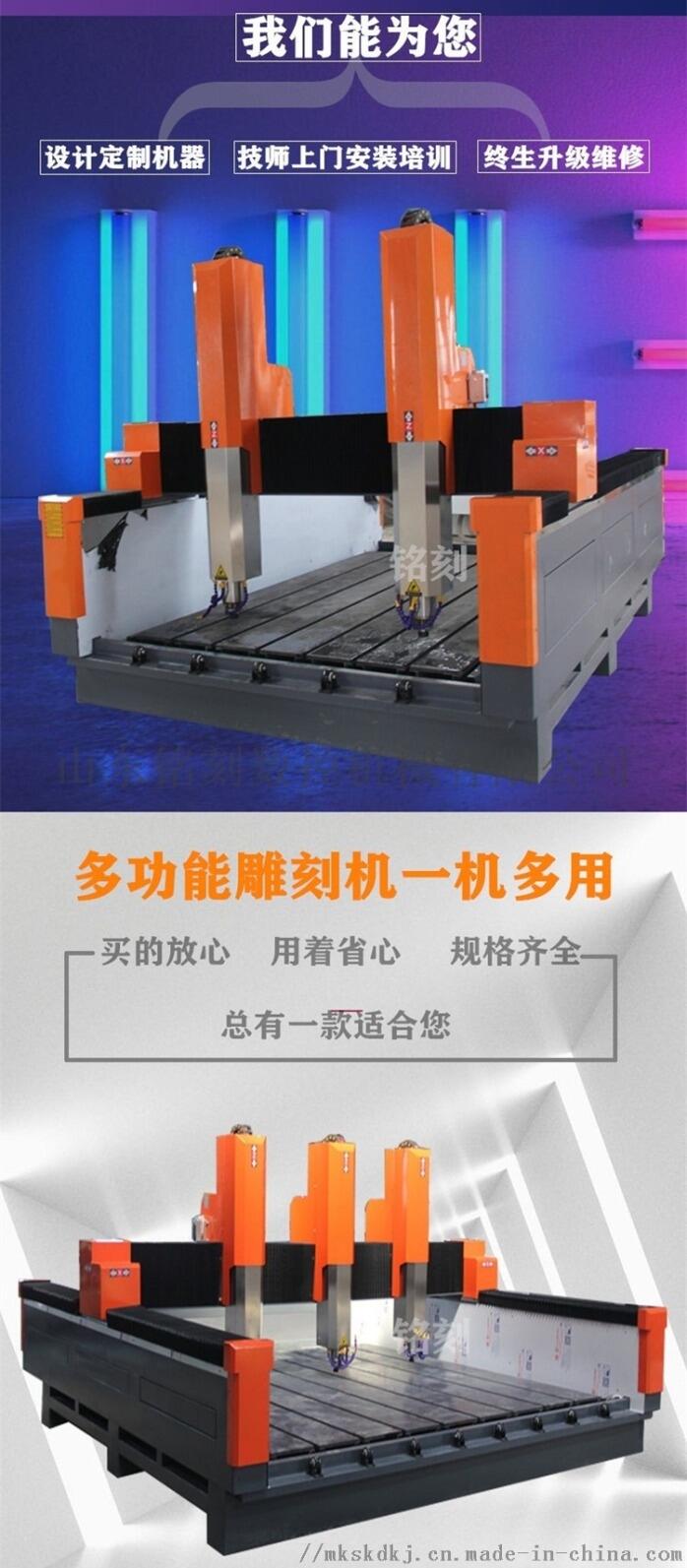 本款数控石材雕刻机雕刻速度快,稳定性强,噪音小,使用寿命长;床身为T型钢支架,采用满焊工艺并经振动时效处理,能确保机器在高速运作时不抖动,不断刀,产品加工面高度光滑;大功率横扭矩主轴,轴承大,转速高,切屑量大,且电机不易受损。