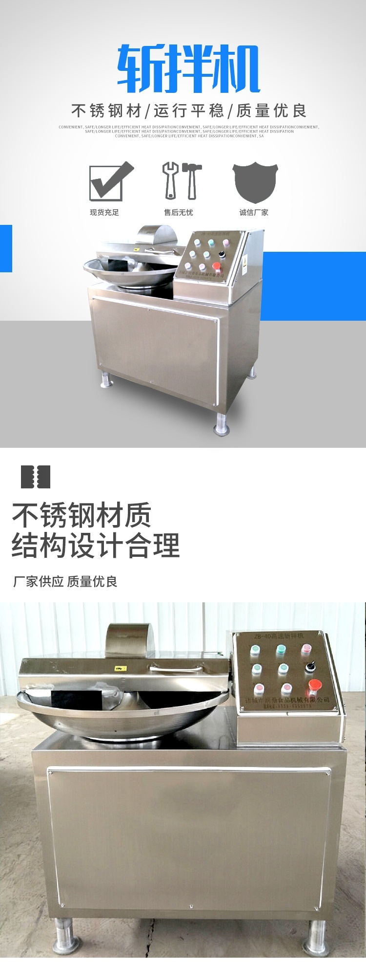 主要用于食品加工如肉丸加工、肠类加工等,也可以用于果蔬的切碎加工等。其次,该斩拌机还可以将主料和辅料搅拌成均匀的乳化物,使斩切和搅拌以及乳化所有工作程序一次完成,不仅增强了肠类制品的细密度、弹性,还大大提高了制品的出品率还有产品质量。该产品内外材质包装全部采用不锈钢,耐腐蚀、易清理,完全符合食品卫生要求,是值得广大客户信赖的品牌。它的斩切作用是十分强大的,能够将肉及辅料快速的斩切成肉馅或者肉泥,像是冰片、水一类的辅料也能同时加入进行均匀的斩拌。斩拌机的斩刀选用的是进口材料经过特殊工艺加工成的,斩锅则是全不锈钢材质制作,能够防溢锅沿,防止渗料、溢料。电器部分采用了防水设计,密封性好,清洗方便,斩锅部分为双速运行,与斩刀速度配合无间,斩拌时间短,物料升温慢。同时设备出厂还配有出料器,出料方便、干净。斩拌后的肉体蛋白质分解为水溶性蛋白,更容易被人体吸收,添加的淀粉等也能与肉体蛋白质互为溶合,得到的产品肉质鲜嫩、口感好,成品出率也高。斩拌机可对肉类,水果蔬菜,海产品及调味品,进行深加工。刀高速旋转,可以缩短运行时间,减少物料发热量,保持馅料的天然色泽。